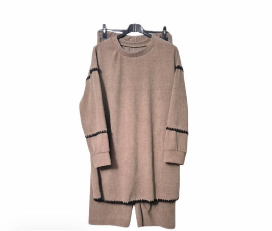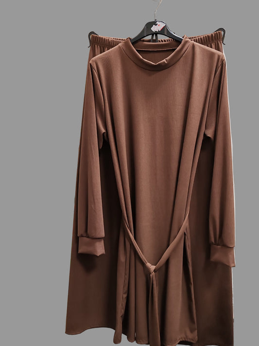 Modest Brown Ribbed Co-ord Set | Tunic Top & Wide-Leg Trousers | Elegant Lounge Wear