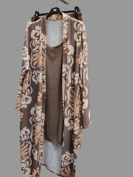 Modest 2-Piece Printed Kimono Co-ord Set | Brown Duster Cardigan & Wide-Leg Trousers