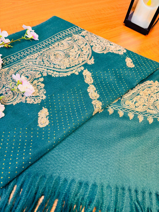 Luxury Deep Blue Teal Cashmere/Pashmina Shawl with Gold/Silver Hand Embroidery