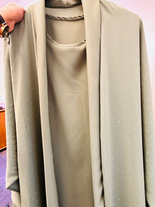 New Women Fashion Elegant Olive Green Embellished Abaya Set Dress Sequence Work With Pant Pocket