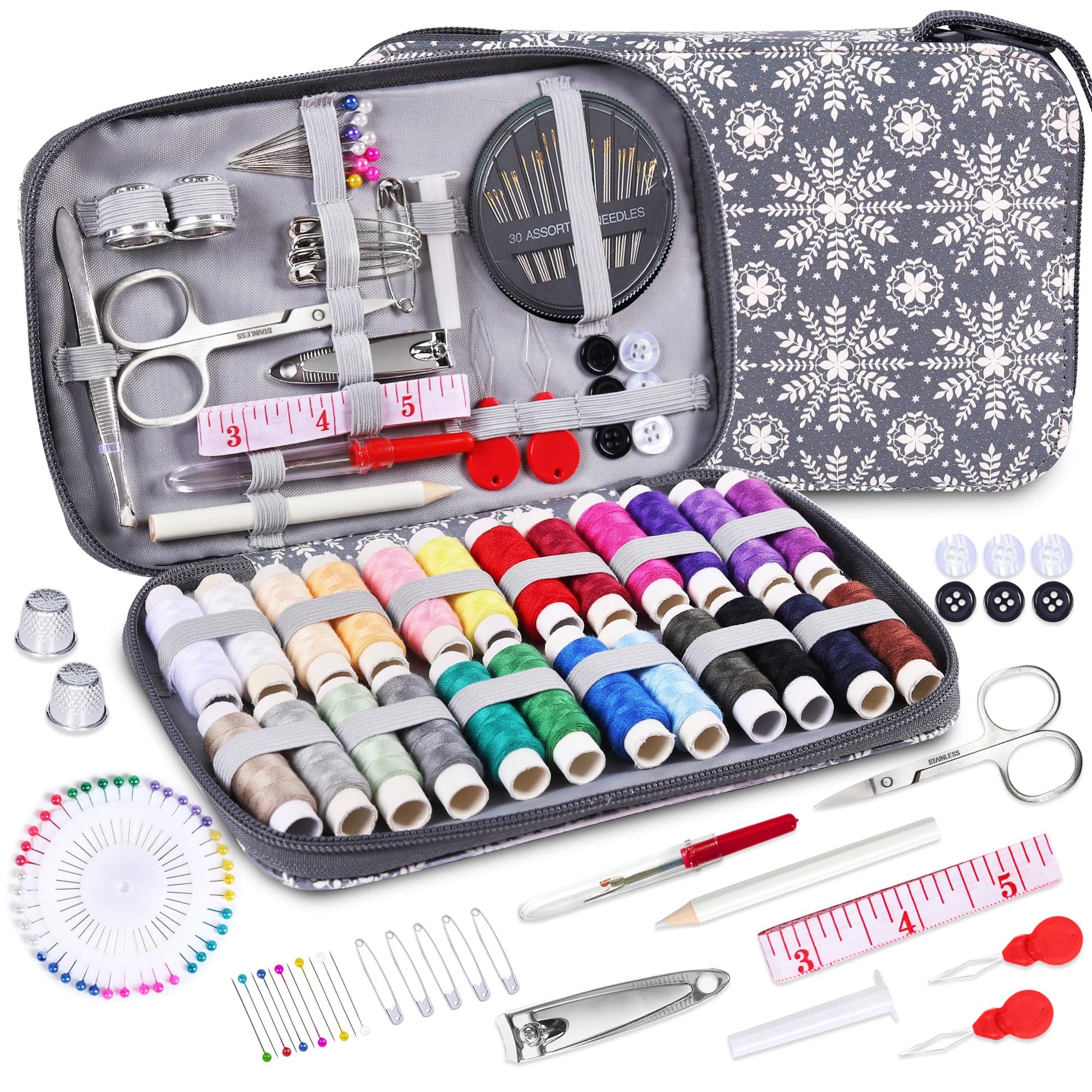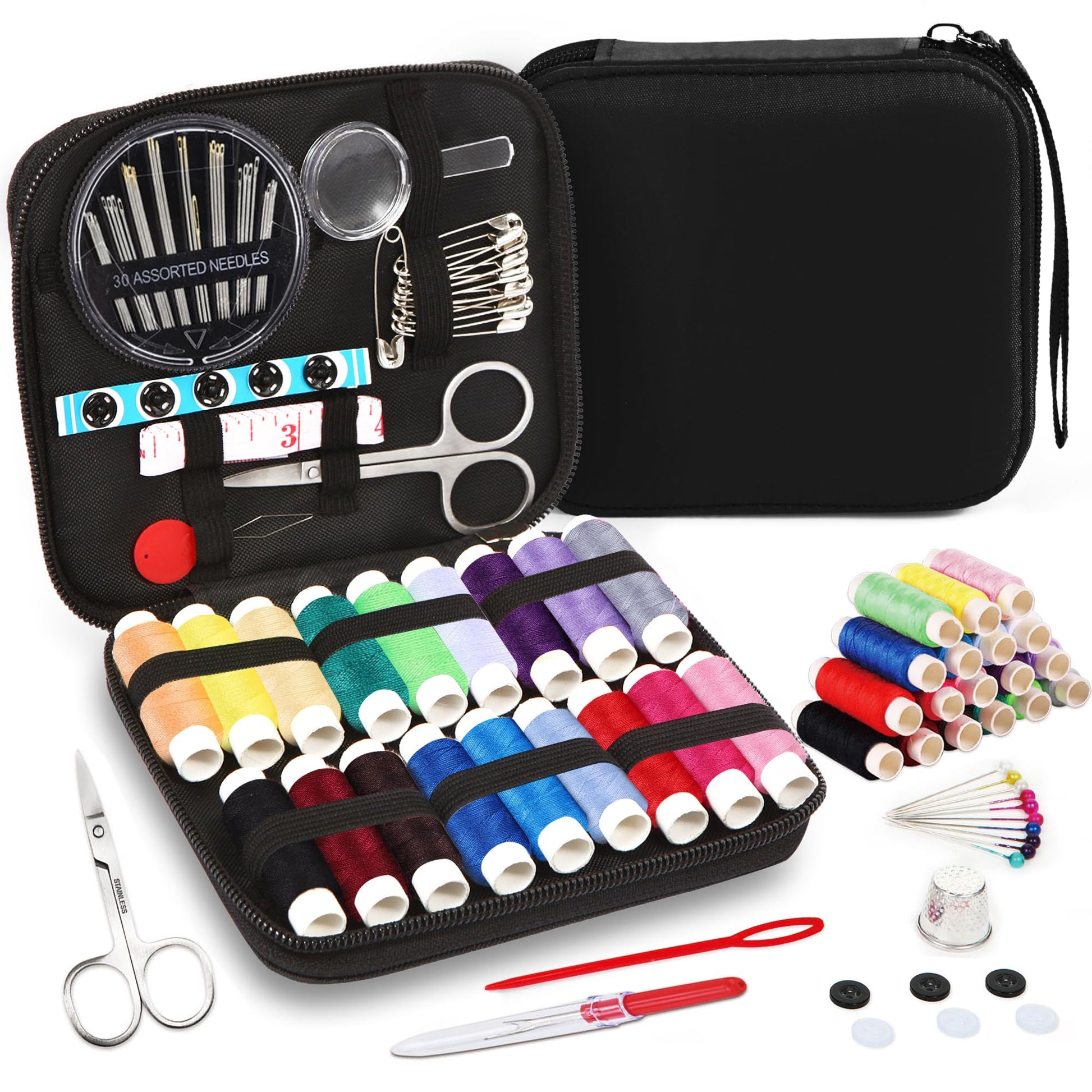 All-In-One Kit: This compact sewing kit includes everything you need in one convenient package: stainless steel scissors, measuring tape, 18 colored threads, 30 needles, 15 color & safety pins, 3 white buttons, 2 needle threaders, and a seam ripper. (Note: The thread colors may slightly vary from the images shown.)