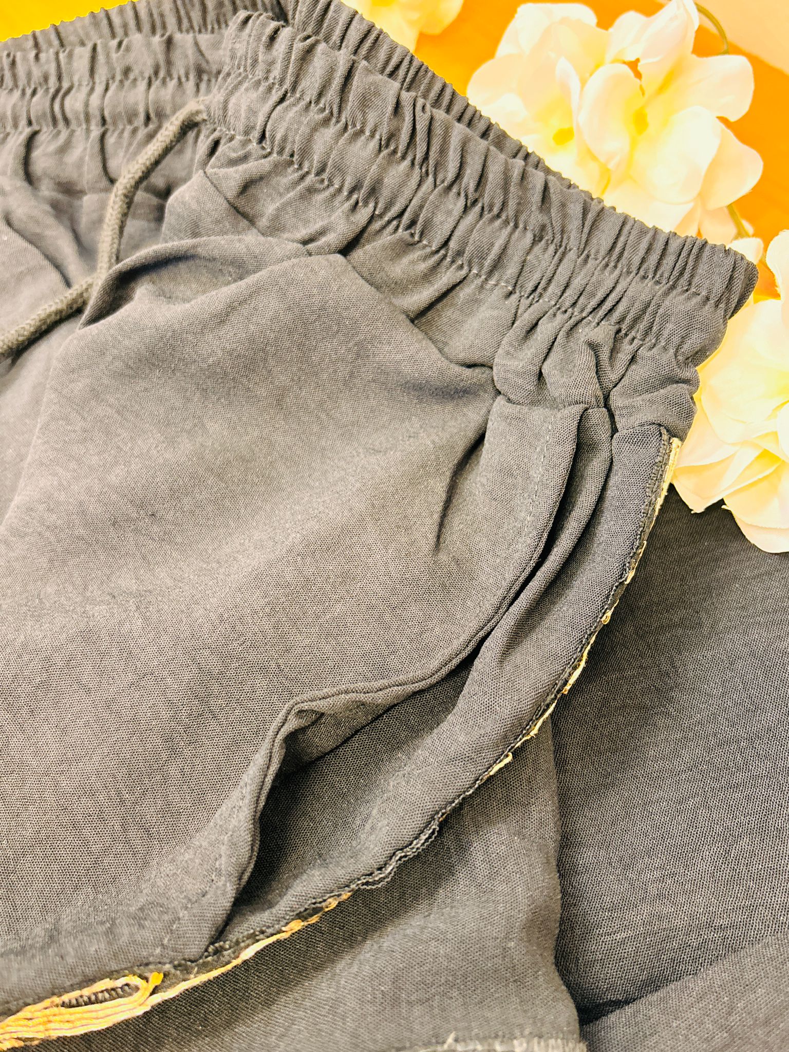 Bottoms : Elasticated waistband with drawstring, wide-leg style