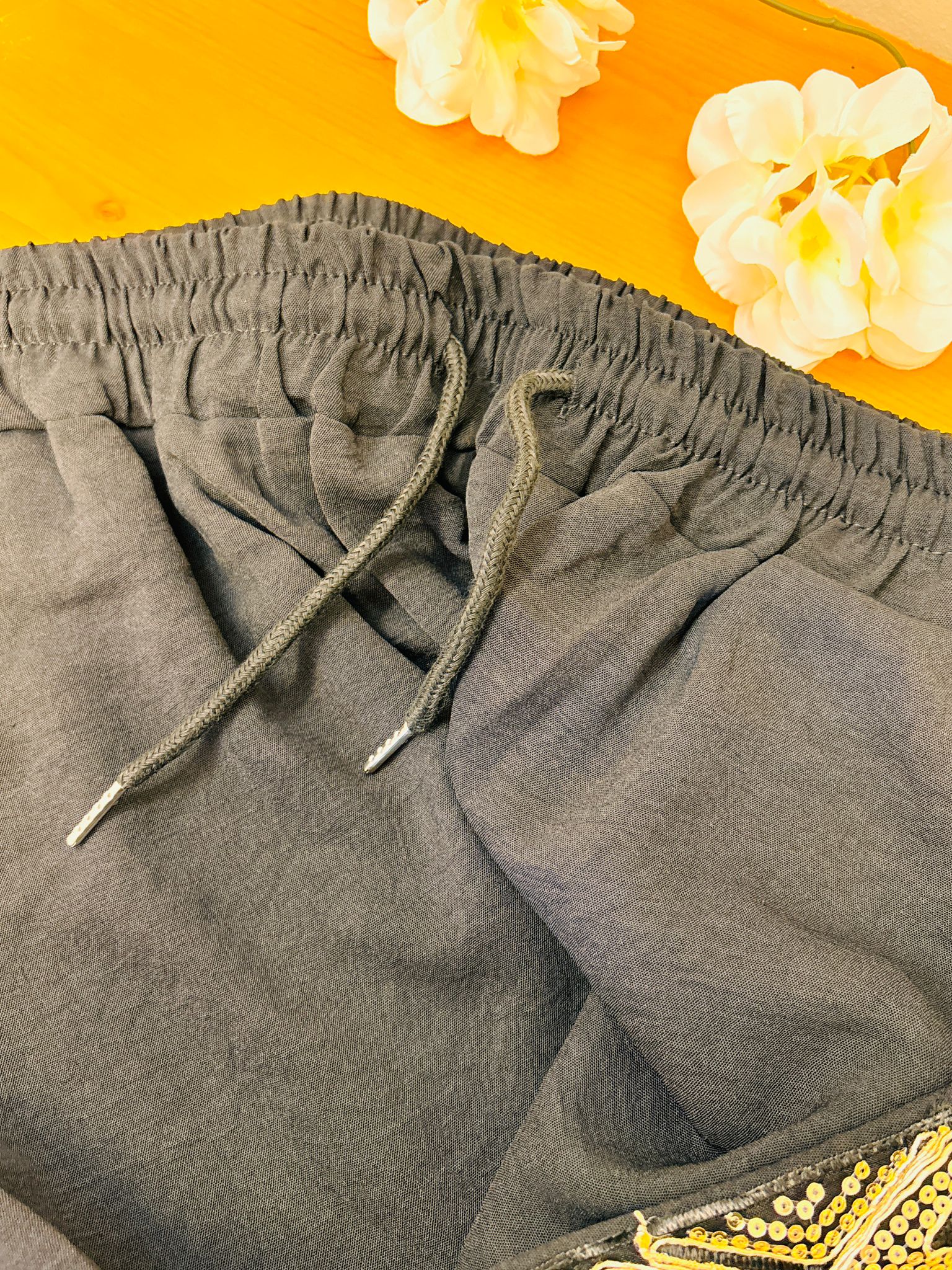 Top : Round neck, full sleeves with sequin embroidery on shoulders and arms