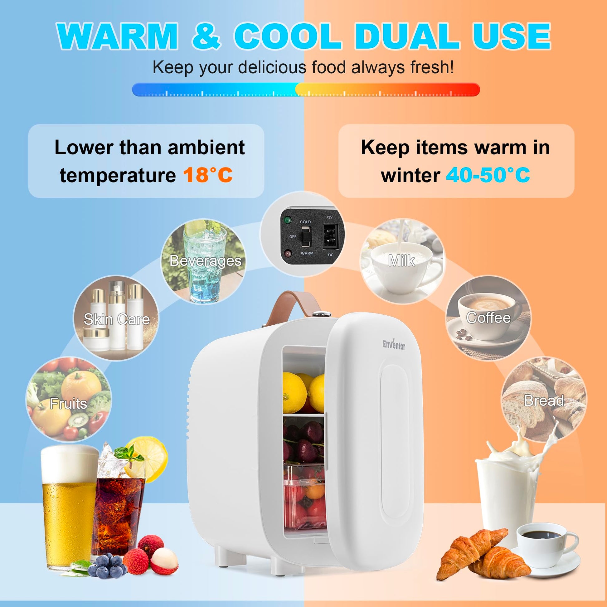 - Dual Function – Cool & Warm – Easily switch between cooling and warming modes. Cools up to 18°C below ambient temperature or warms up to 40–50°C. Suitable for storing beverages, fruits, skincare products, or keeping coffee and meals warm.