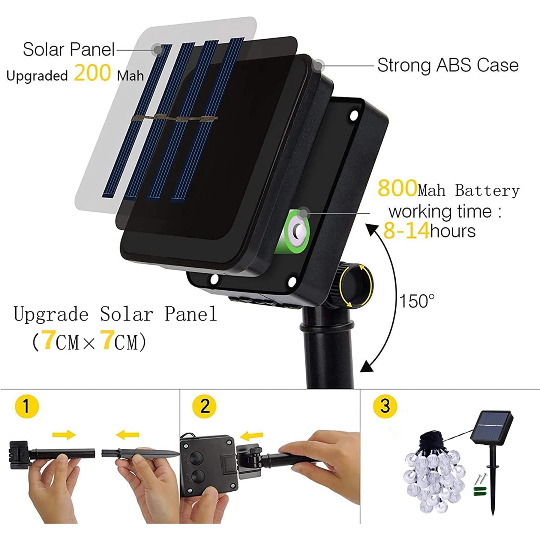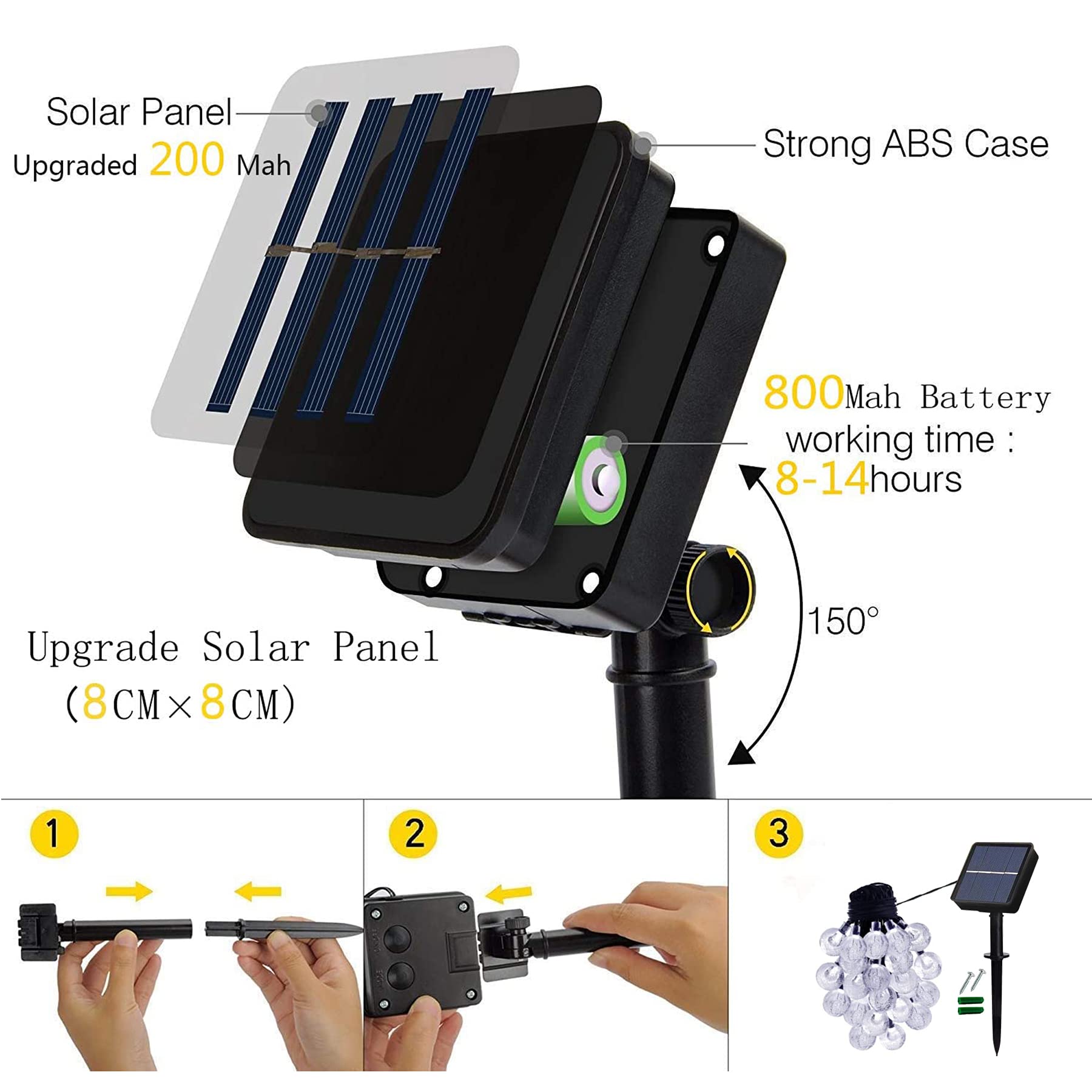 - 【Energy-saving & Eco-friendly】: Charged by solar energy, eco-friendly and without electric cost, no need to replace the battery. During the day, the efficient solar panels converts sunlight into electrical energy built into rechargeable batteries, and then string lights will automatically light up at night.