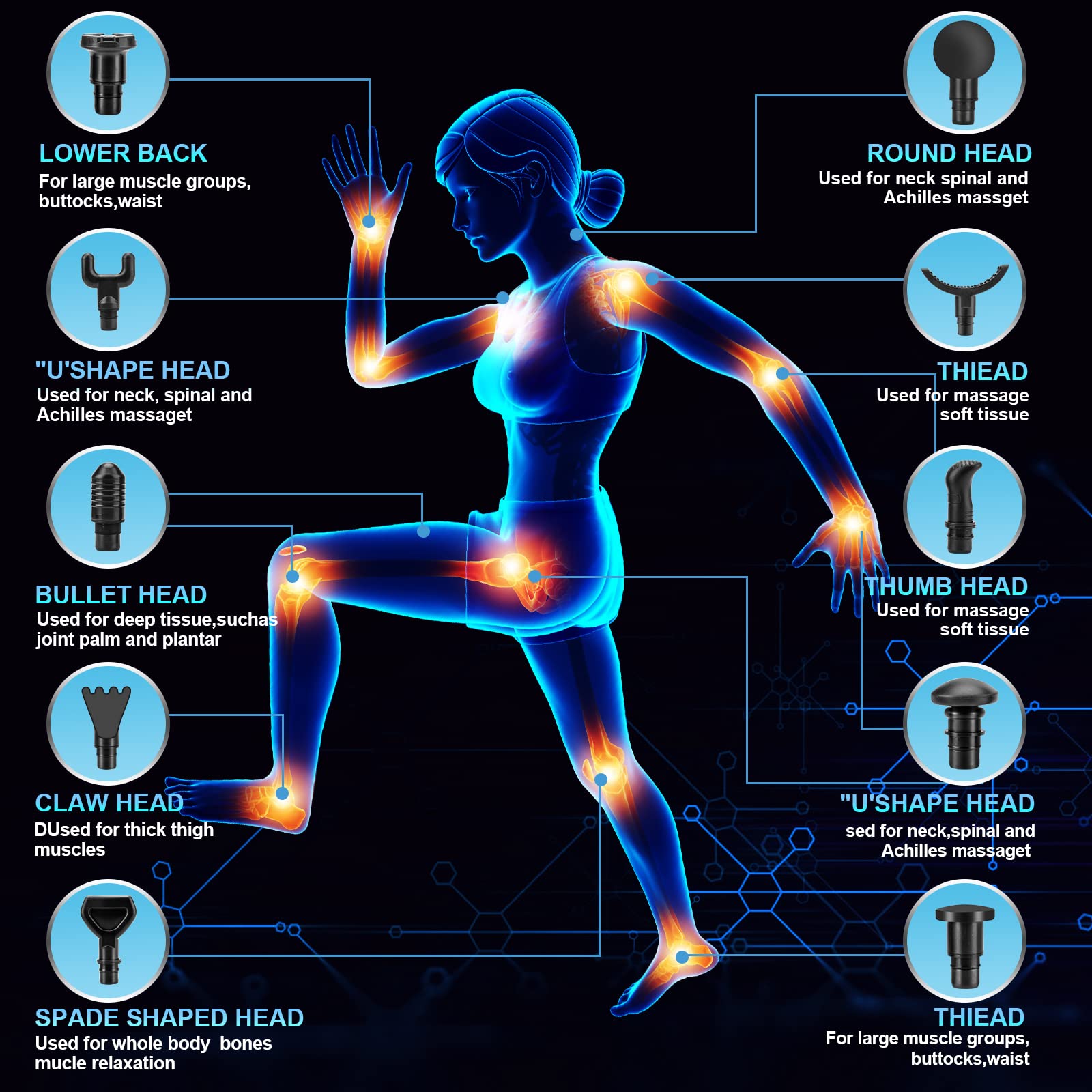 10 Professional Massage Heads: The Zerolia deep tissue massager comes with 10 interchangeable massage heads, each designed for different muscle groups to ensure targeted therapy for faster recovery. These heads allow you to address various muscle relaxation needs across your body.