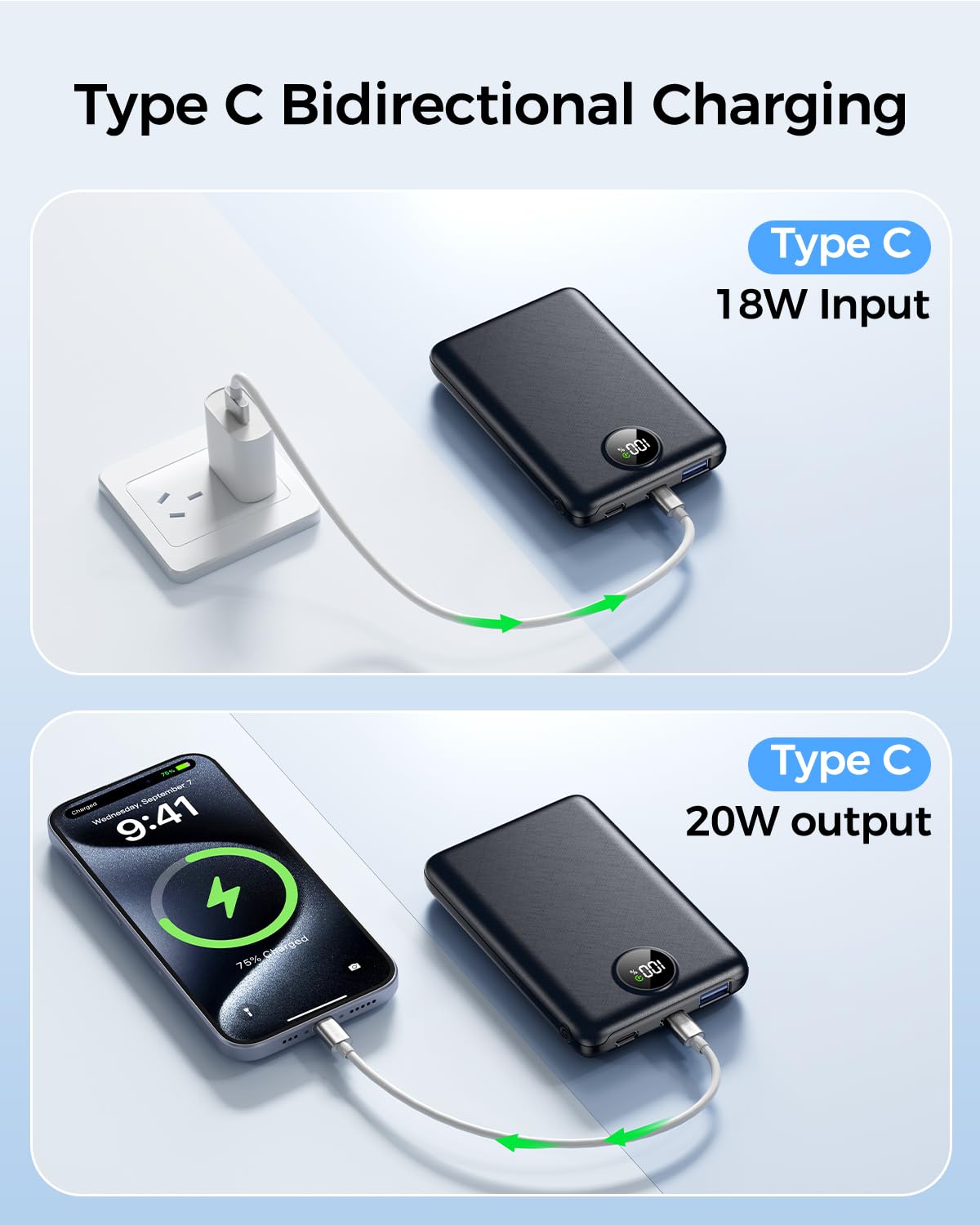 Keep track of your power bank’s battery level and charging status in real time.