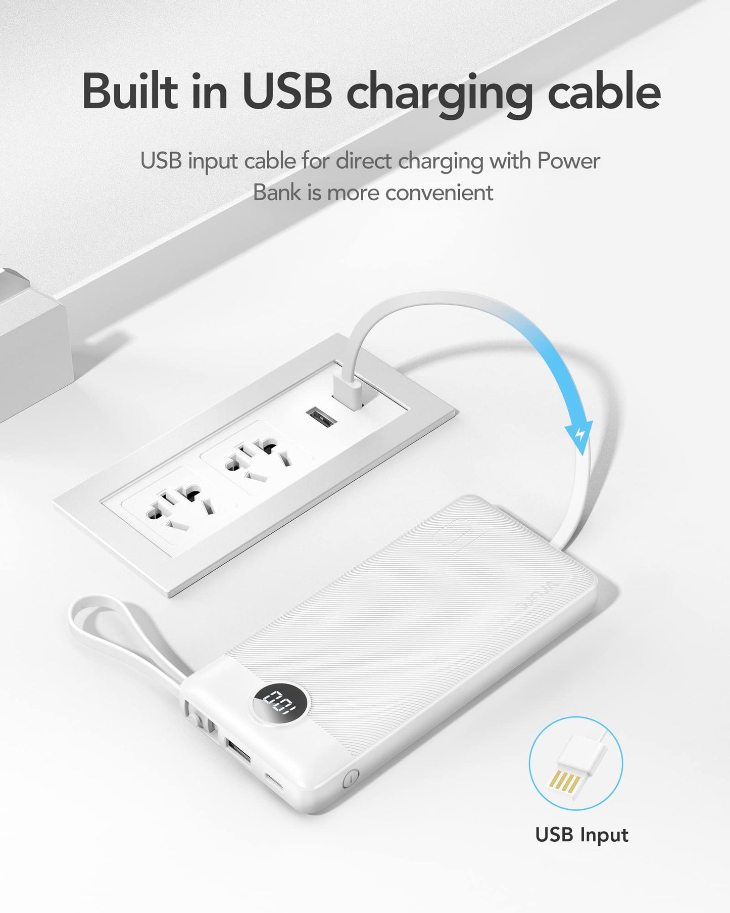 ✅ Power Bank with Built-in Cables – Comes with 4 integrated charging cables (USB, Micro USB, USB-C, and Lightning for iPhone). It also has a built-in USB input cable to recharge the power bank itself, so there’s no need to carry extra charging cords.